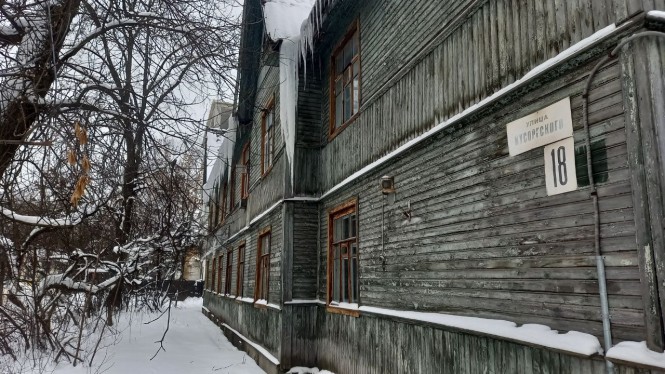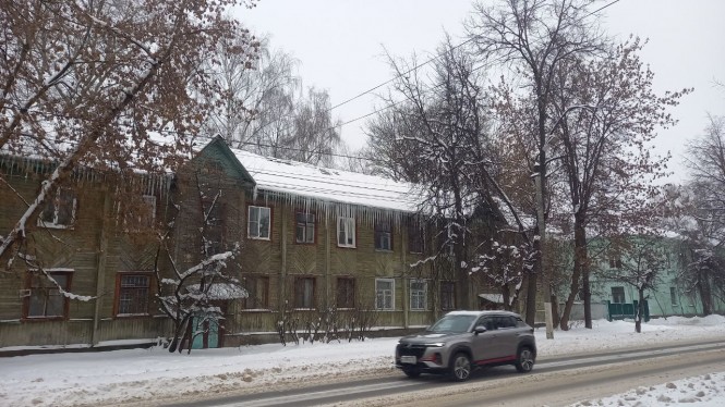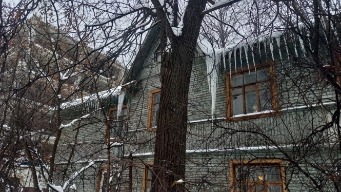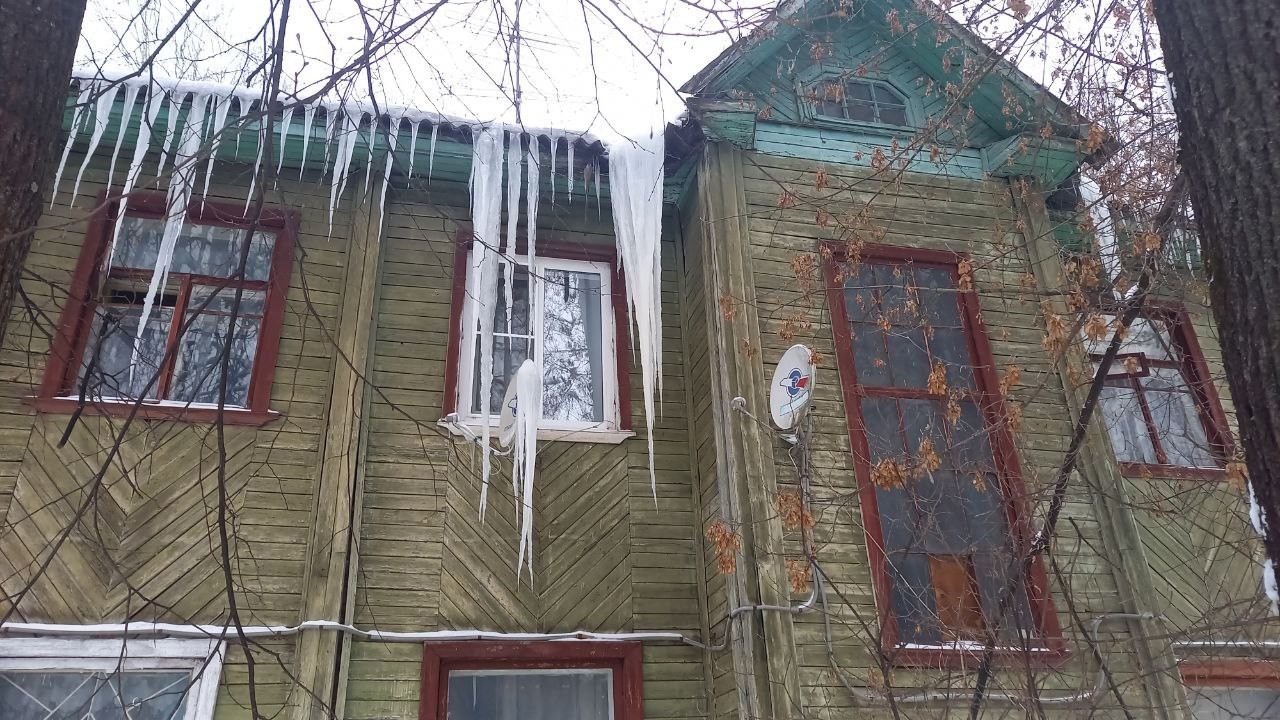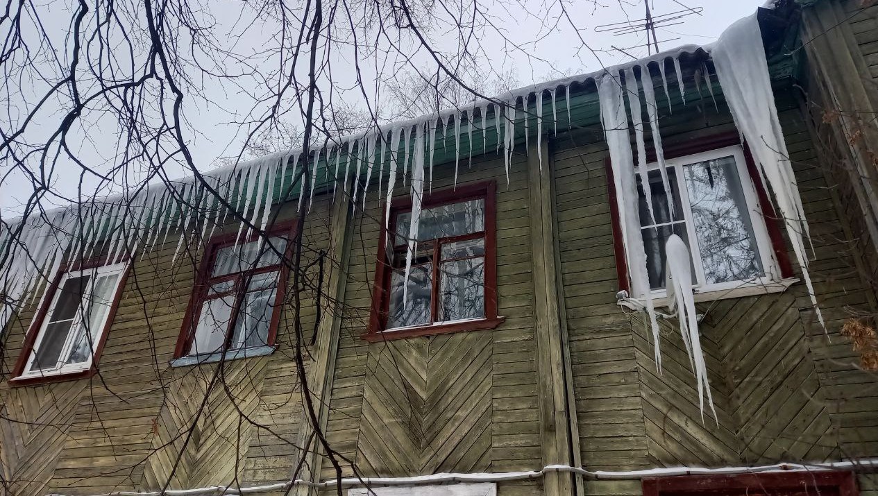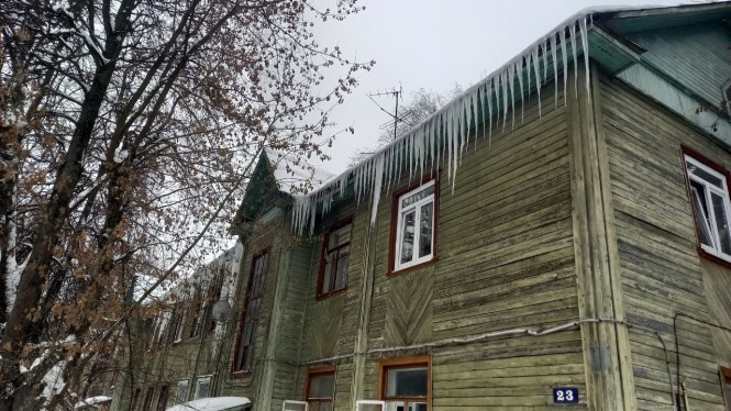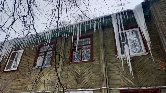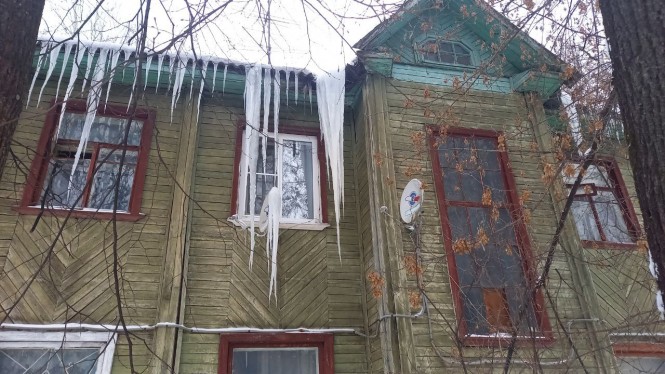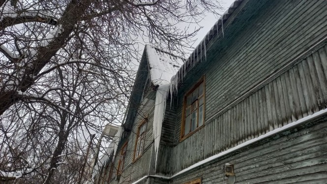 В Твери на улице Мусоргского очень много очень старых домов, их еще называют бараками. Деревянные, многоквартирные строения в этом районе частично расселили, но не все. Некоторые халупы по-прежнему жилые и каждый год на них вырастают сосульки-сталактиты.