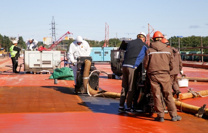 Непосредственно на мостовом переходе через Волгу полностью завершены работы по опусканию пролётных строений левого и правого направлений на постоянные опорные части. Продолжаются укладка специального гидроизоляционного слоя и антикоррозионная обработка пролётов, сформирована тротуарная часть моста, установлены перила. Затем начнётся устройство асфальтового полотна, по которому будет организовано движение автотранспорта. На площадке задействовано 140 человек и 55 единиц техники.