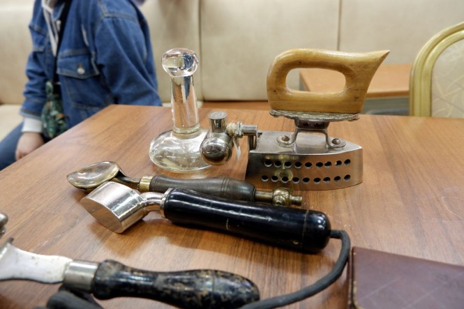 Мария Губанова показала редкий утюг из Китая, созданный во второй половине прошлого века. Его уникальность заключается в том, что кроме утюга к устройству крепится миниатюрный фен — удобная штука для путешествий. Еще один портативный утюг похожего назначения питается от пальчиковых батареек. Стоит отметить и тот факт, что все бытовые предметы функционируют и готовы к работе.