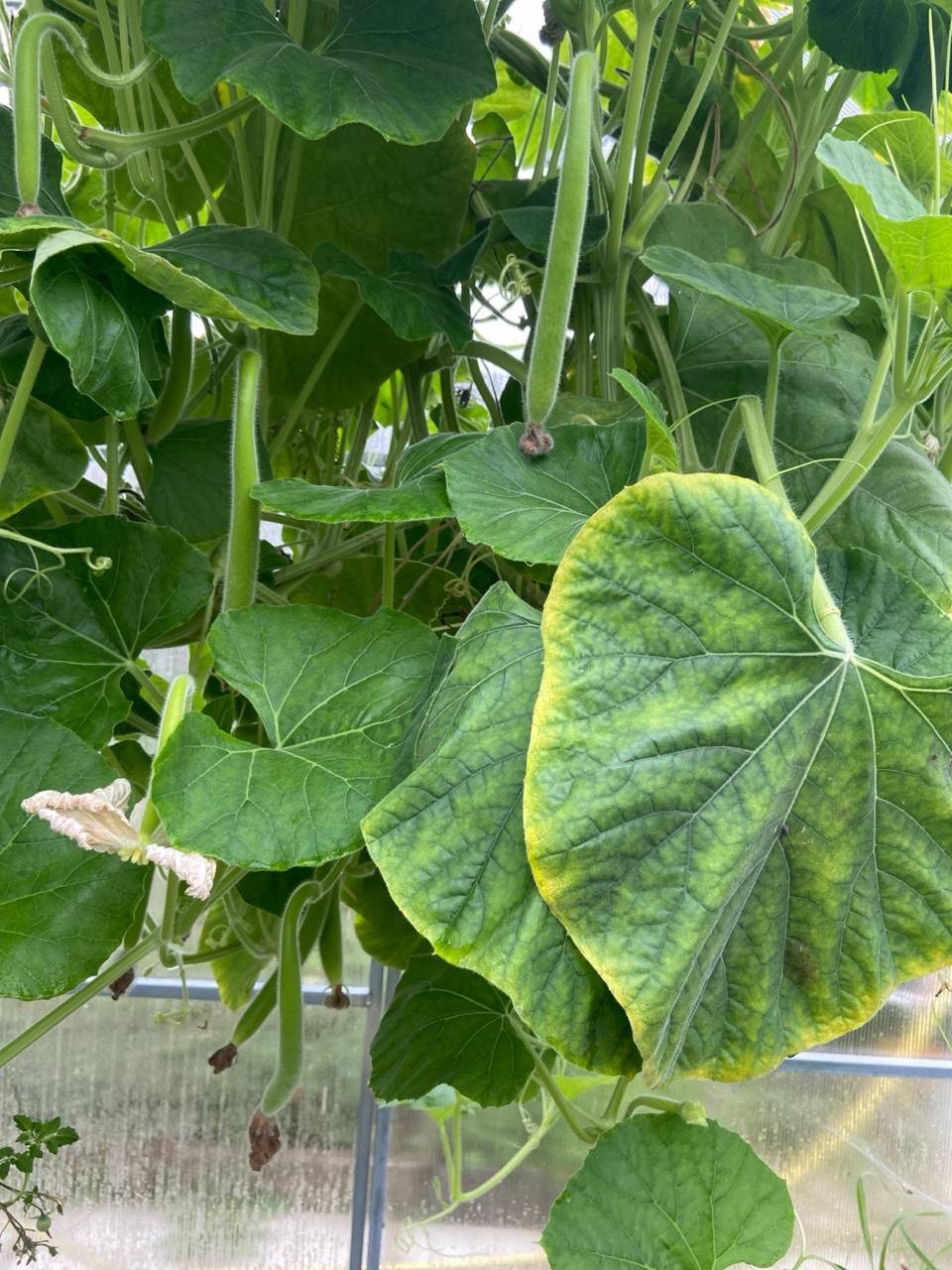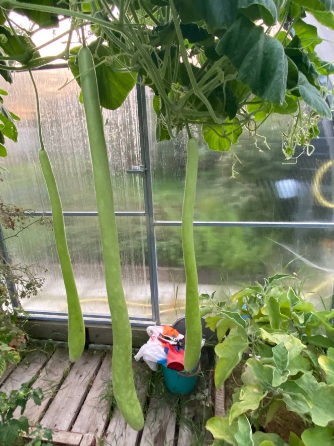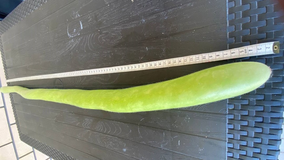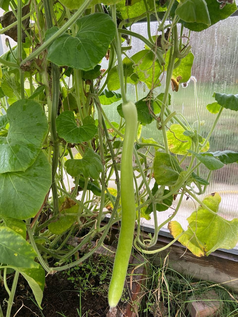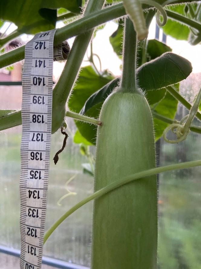 - Этот сорт называется "Армянский огурец" или "Змеевидная дыня", семена заказывала на маркетплейсе. Я посадила одну семечку, и в теплице выросла целая лиана, а на лиане - шесть огурцов и все более метра длиной. Самый большой – 140 см.