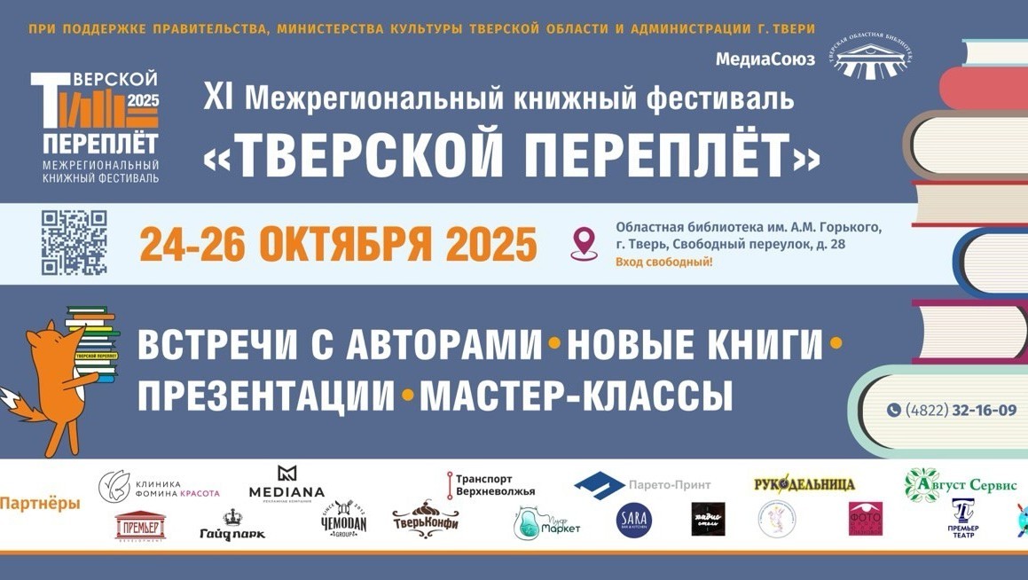 Напомним, ХI Межрегиональный книжный фестиваль "Тверской переплет" состоится 24-26 октября в Областной библиотеке им. А.М. Горького. Следите за анонсами событий на нашем сайте!