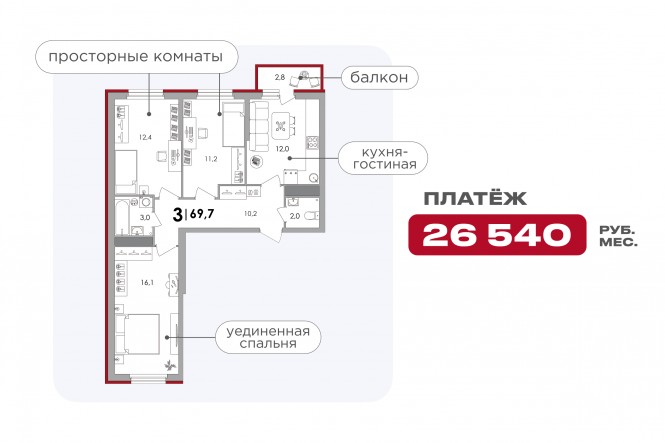 - 3-комнатная: ежемесячный платеж ≈ 26 540 ₽