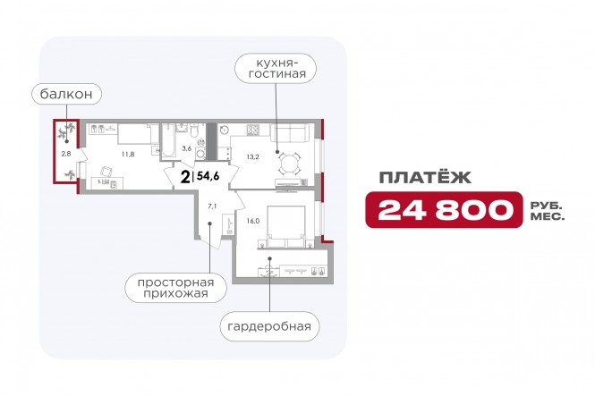 - 2-комнатная: ежемесячный платеж ≈ 24 800 ₽