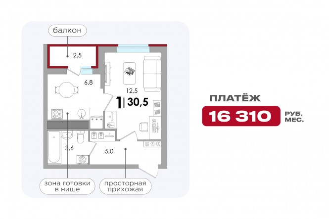 - 1-комнатная: ежемесячный платеж ≈ 16 310 ₽
