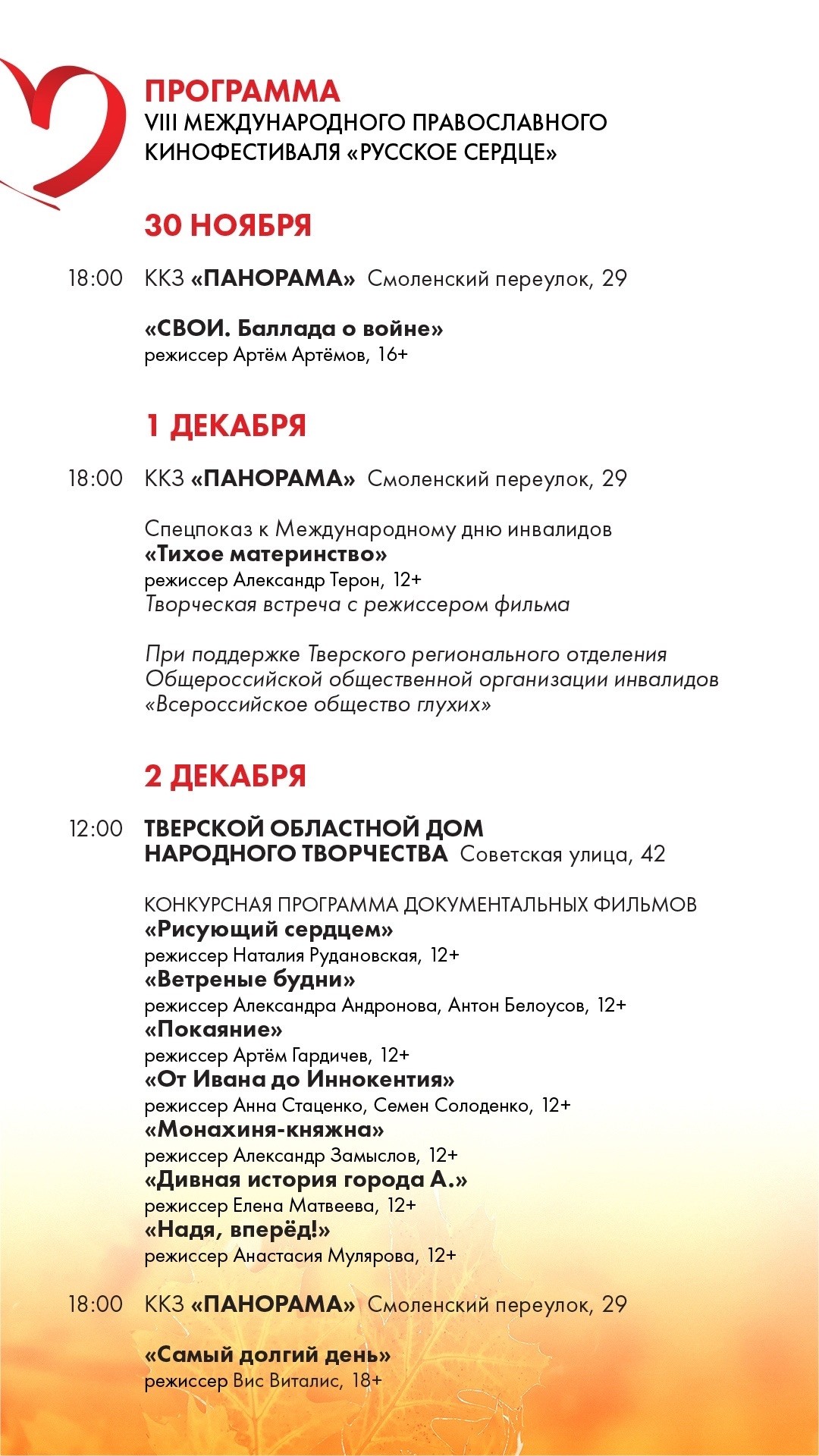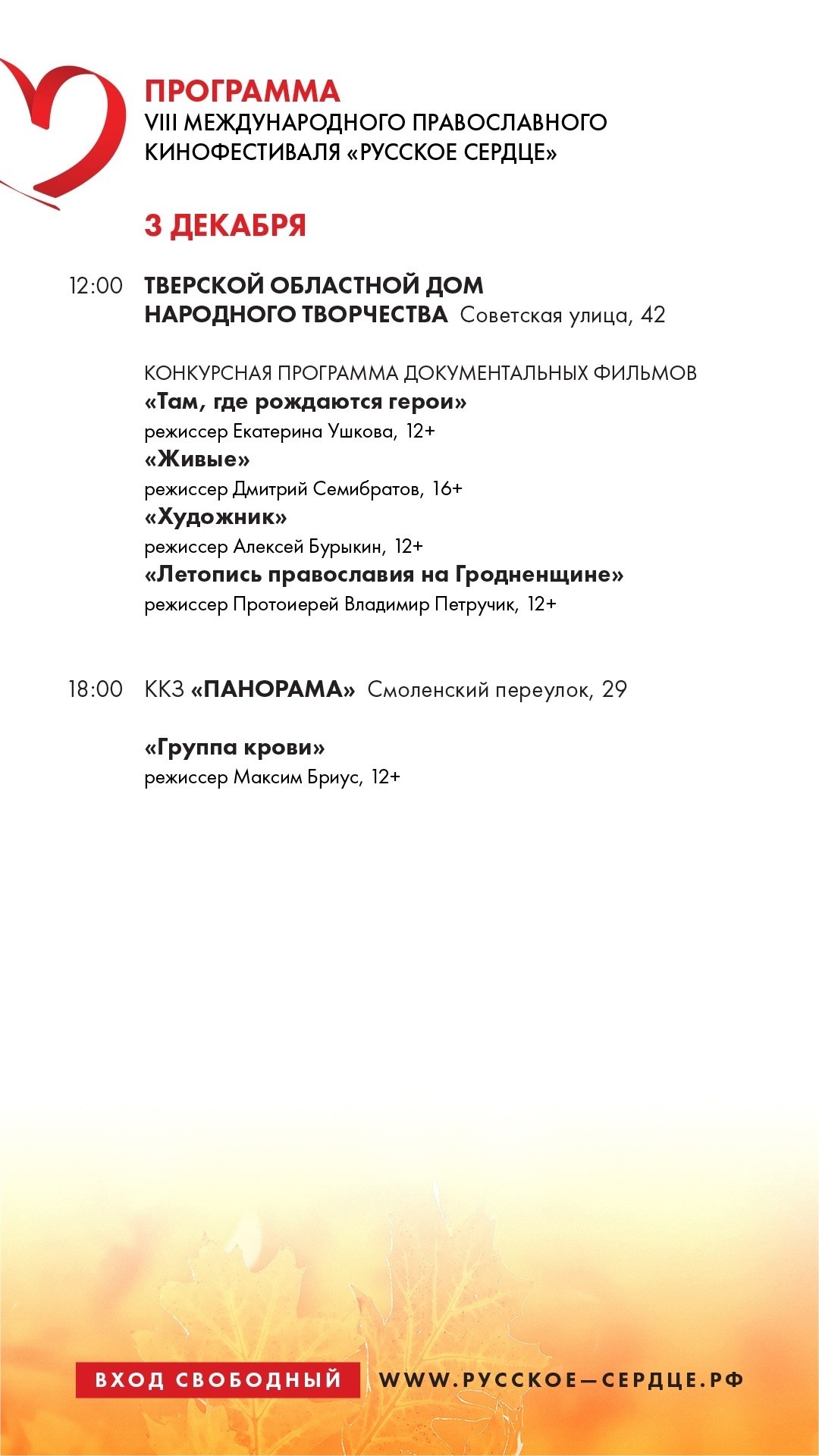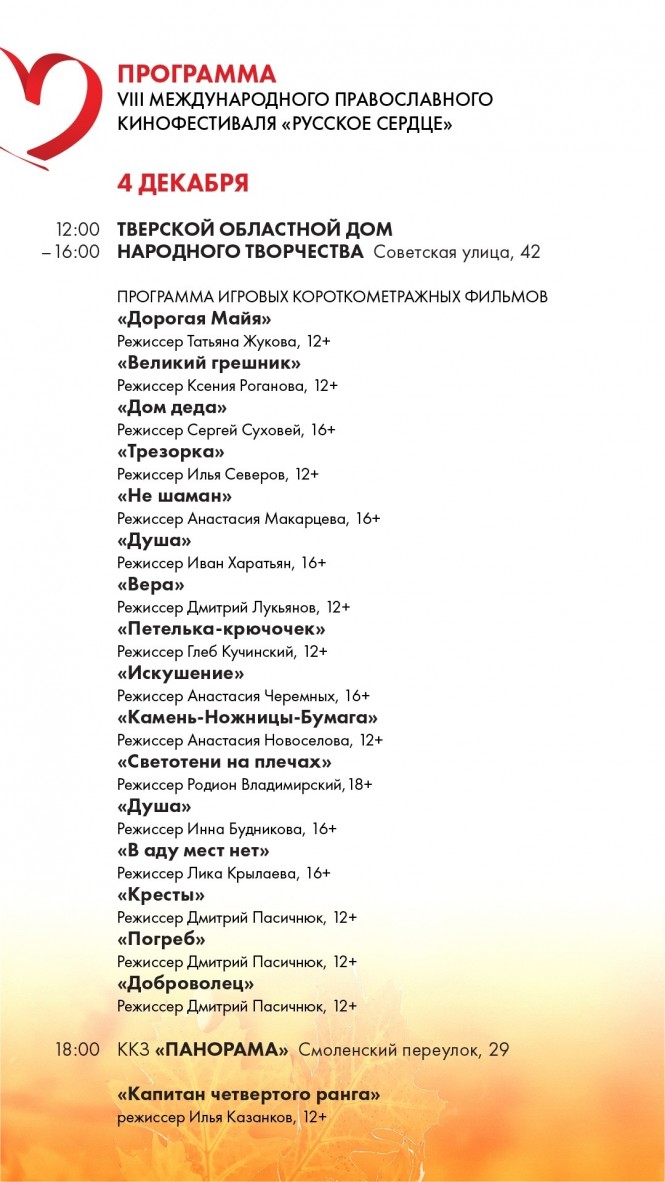 Конкурсная программа этого года включает в себя игровые полнометражные фильмы, игровые короткометражные фильмы, неигровые фильмы и детскую анимационную программу. Ознакомиться с программой кинофестиваля можно на сайте www.русское-сердце.рф, а для общения со зрителями активно развиваются страницы "Русского сердца" ВКонтакте и телеграм-канал.