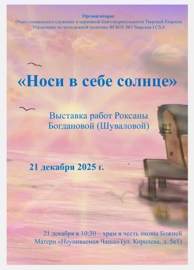 21 декабря приглашают посетить выставку творческих работ Роксаны Богдановой (Шуваловой) "Носи в себе солнце" (6+) в храме в честь иконы Божией Матери "Неупиваемая Чаша". Экспозиция наглядно показывает, что творить и выражать свой богатый внутренний мир может каждый человек, несмотря на ограниченные возможности здоровья.