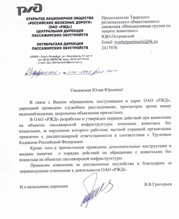 В Инициативной группе по защите животных рассказали, что зооволонтеры получили официальный ответ от ОАО "РЖД" по поводу случившегося.