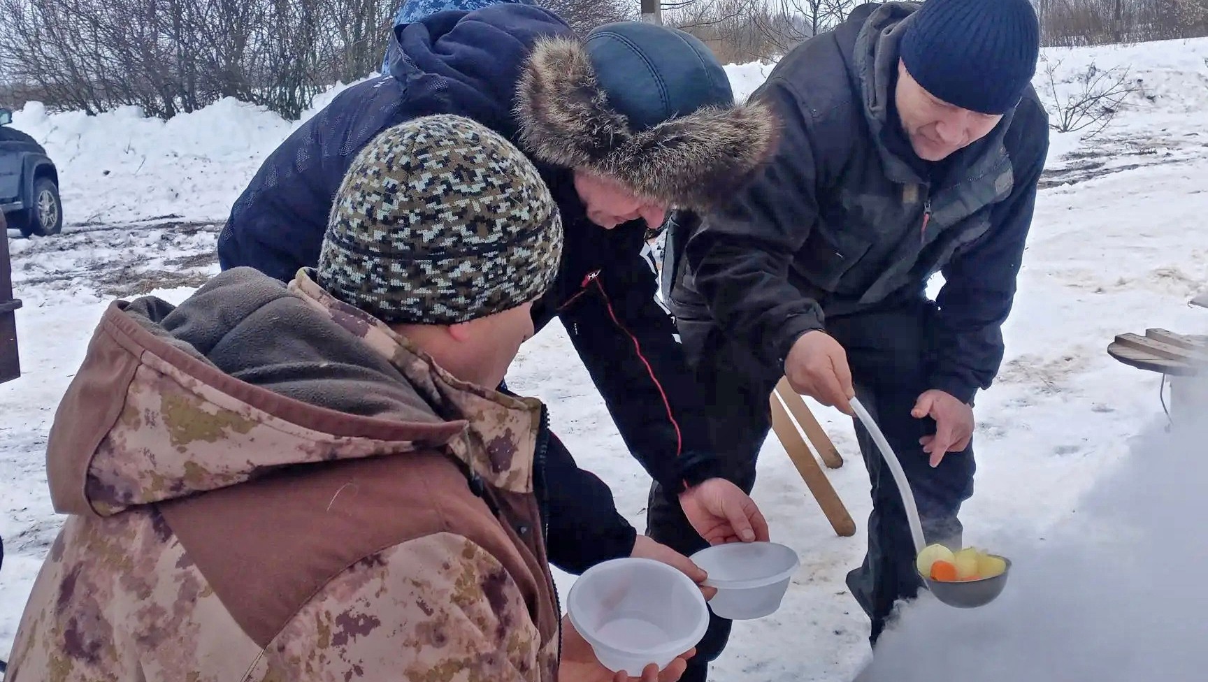 Уху на костре приготовили из щук, окуней и плотвы. Ароматного блюда с добавкой хватило всем.