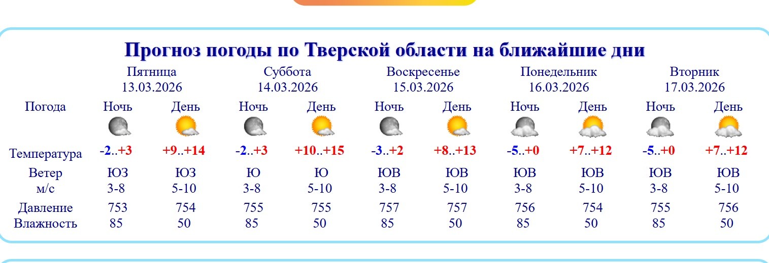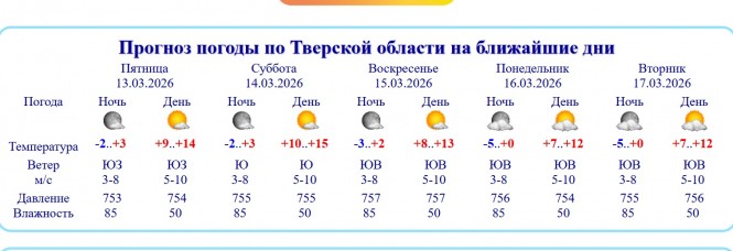 Как сообщает сайт тверского гидрометцентра, завтра, 14 марта в регионе воздух прогреется до +15, будет солнечно. В воскресенье вновь ожидается солнечная погода и до +13 днем. Такая погода сохранится и в начале новой рабочей недели.