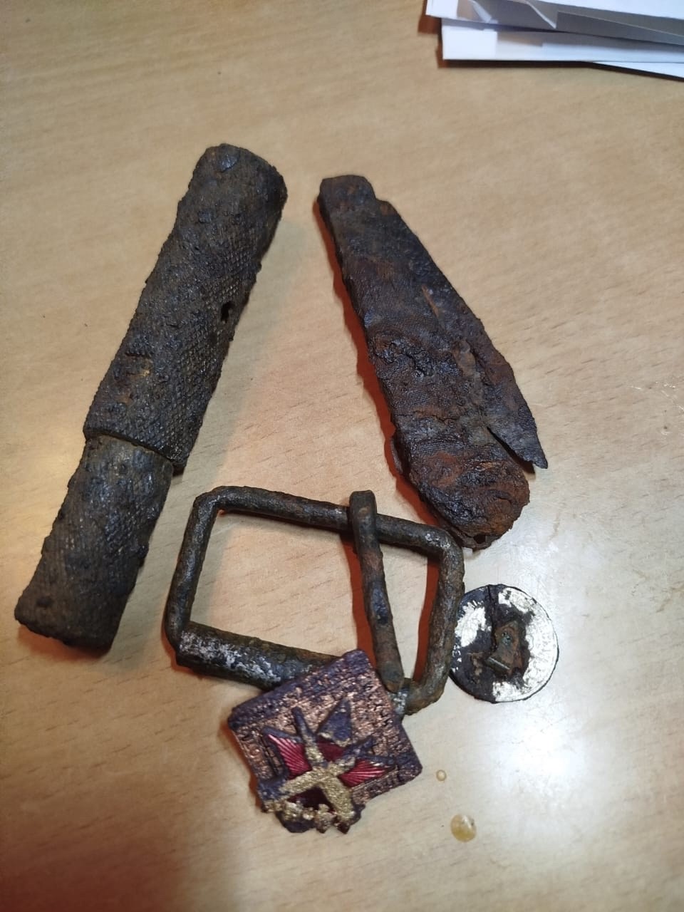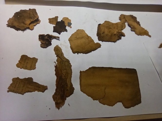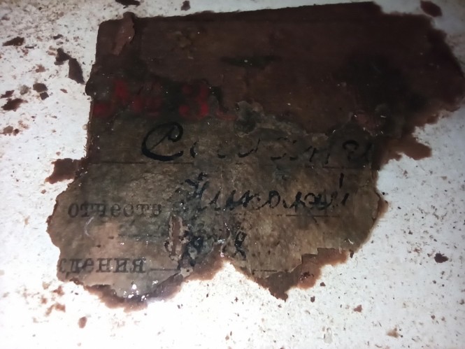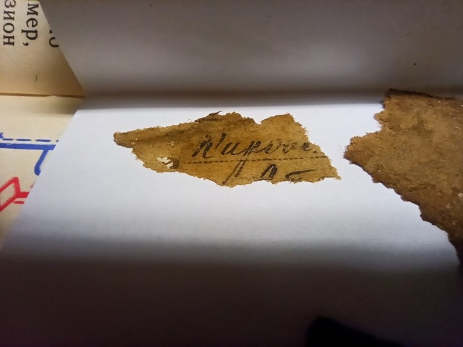 При втором погибшем были обнаружены эмалированный треугольничек, что соответствовало званию сержантского состава, нашли правда только один, значок довоенный за отличную артиллерийскую стрельбу, наган, бинокль – такие маленькие зацепочки, указывающие на какой-то сержантский командирский состав, самый младший. Также были найдены бумаги, обрывки каких-то документов, мы их забрали вместе с медальоном. Медальон вскрыли, закручен он был абсолютно негерметично, к сожалению, как источник информации он был утрачен, бумага сохранилась ужасно, прочтению она не подлежала. А вот остатки книжки, которая могла дать зацепки, разбирал поисковик отряда "Ополченец". Разбирал долго, по слоям.
